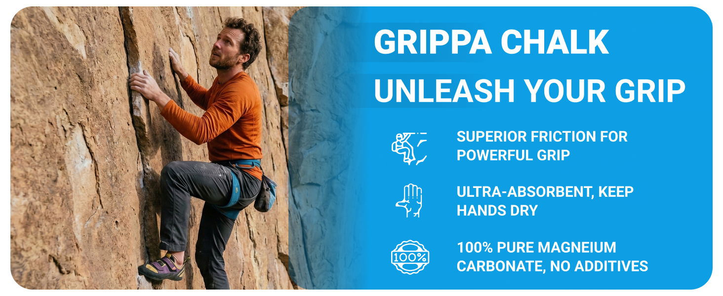 Built for every discipline: rock climbing, bouldering, sport climbing, gym chalk, gymnastics chalk, workout chalk, and powerlifting chalk. If you need your hands dry and your grip locked, Grippa delivers.